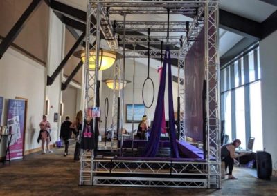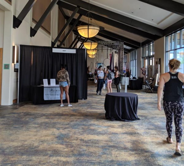 Walking into the main room was like walking into a pole paradise. The first thing you saw before moving into the showcase and vendor room is trussing with lyra hoops, poles, and silks all set up for free play time.